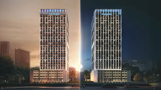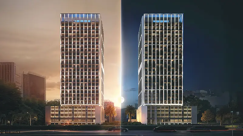 As every structure created by Binghatti has been an architectural piece of art, Moonlight is a geometric construction and a masterpiece of senses. Its architecture focuses on a facade in crystalline glass-reflected, translucent and lively with light. The rhythmic nature of the building replicates a silent conversation between natural and man-made. On its highest point a clear open structure shines under the moon beaming and glistening as an inspiration of light that does not need to be a beacon. This design does not just show a design, it outlines a philosophy- a dialogue between space, lights and silence.